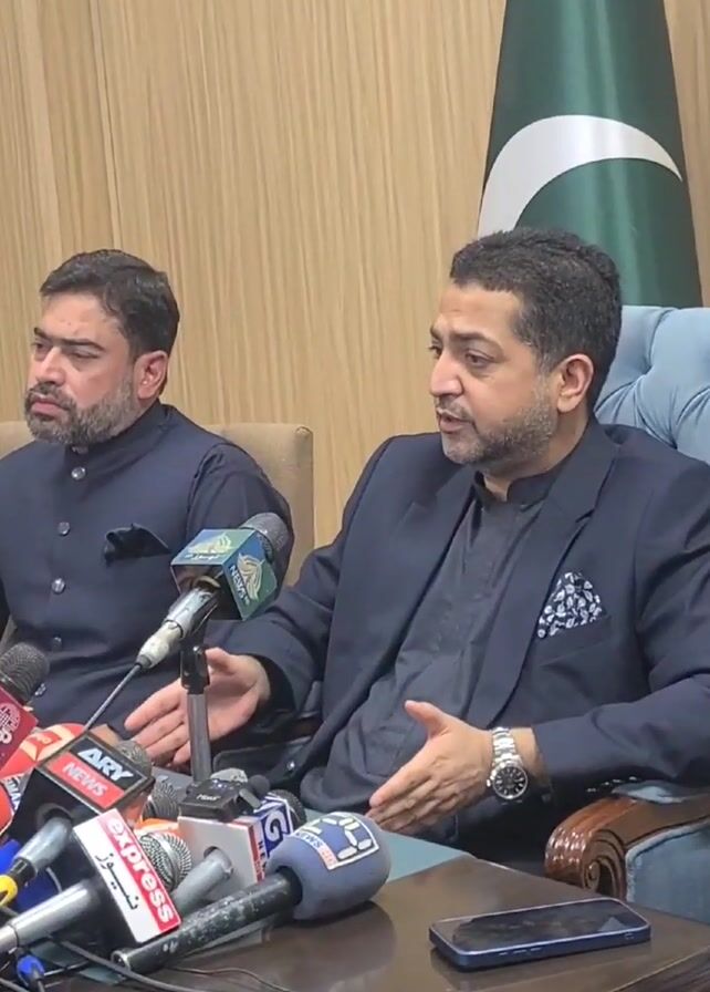 Two men are seated at a table with multiple microphones in front of them. The man on the right is speaking and gesturing with his hands. Both men are wearing dark suits. A Pakistan flag is visible behind them. A smartphone is recording the scene from the bottom right. The background consists of wood paneling.