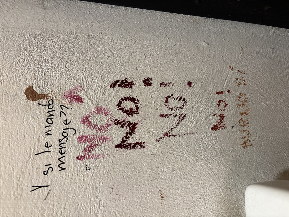 Graffiti adorns a textured, off-white wall. Phrases in Spanish, "Y si le mando mensaje??" (And if I send him a message??), "NO!" (No!), and indecipherable writing are present. The "NO!" is repeated twice in reddish-brown, seemingly written with lipstick, adjacent to pink lip prints. A small heart is also drawn near the lipstick messages. The background wall is stained, with a possible drip mark visible on the upper left.