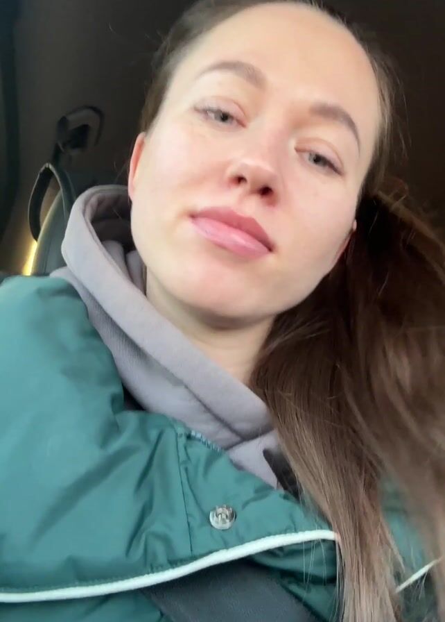A young woman with fair skin and long brown hair is recording a selfie video while in a car. She is wearing a green puffy jacket over a grey hoodie. She looks directly at the camera with a slight smile. The background shows the interior of the car, including a headrest and a glimpse of another person in the passenger seat. The car seems to be in motion, and music is playing.