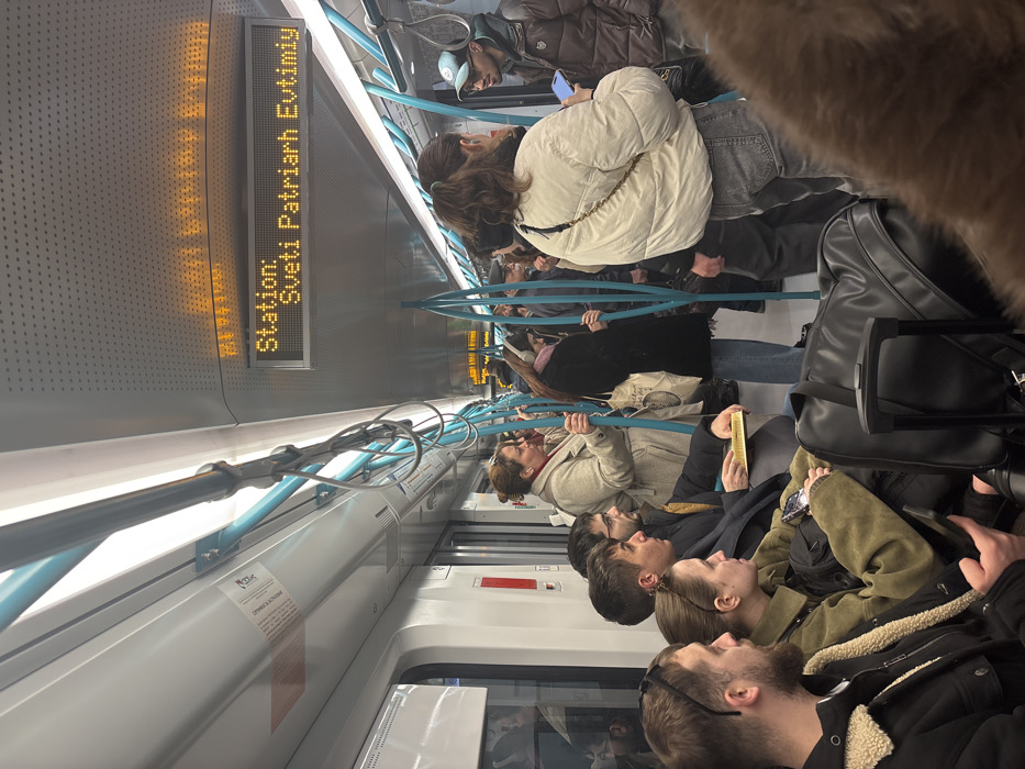 The image displays the interior of a modern, white-paneled subway train car, populated by multiple passengers. An overhead digital display, centrally located in the upper frame, reads "Station: Sveti Patriarh Evtimiy," identifying the location as a metro station in Sofia, Bulgaria. The train car's architecture includes white ceiling panels, integrated LED strip lighting, and a network of teal-colored vertical support poles, horizontal grab bars, and suspended hand straps. Approximately fifteen individuals are visible within the frame, occupying both seated and standing positions. In the immediate foreground, three passengers are seated on a dark bench-style seat: a bearded man in a black jacket with sunglasses resting on his head, a woman in an olive-green jacket, and a man with dark hair and glasses holding a yellow booklet. All three are facing the left side of the frame. Standing passengers are concentrated in the central and right areas of the train car. A woman wearing a cream-colored puffer jacket holds a blue smartphone, appearing to interact with a man in a green baseball cap and a brown padded jacket, who is also holding a phone. To her left, a woman in a long black coat with over-ear headphones is looking down at a black smartphone. Further left, a woman in a beige overcoat stands, gripping a teal vertical support pole. A black piece of rolling luggage with a telescopic handle is positioned on the floor in the right foreground. A white rectangular sign with red lettering and Cyrillic text is affixed to a ceiling panel above the windows on the left side of the car.