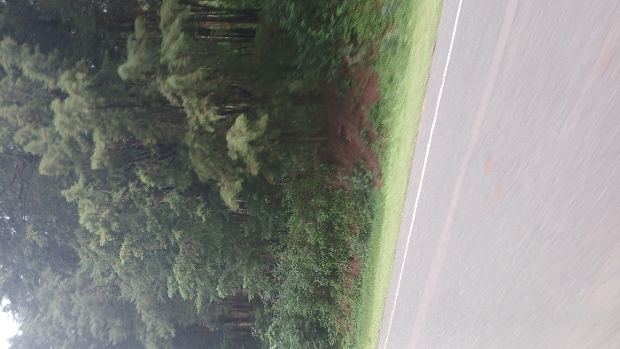 A photograph depicts a roadside environment in Moticho ward, Kenya. The lower third of the frame shows a grey paved road surface, exhibiting motion blur, with a solid white line delineating its left edge. Faint, reddish-brown marks are discernible on the road surface to the right. Adjacent to the road, a strip of green grass borders an ascending embankment covered with dense green shrubs and smaller trees. Beyond this, the background is dominated by a thick stand of tall, dark green trees, consistent with a forest or wooded area, some exhibiting motion blur. The scene is devoid of individuals, vehicles, or man-made structures apart from the road itself.