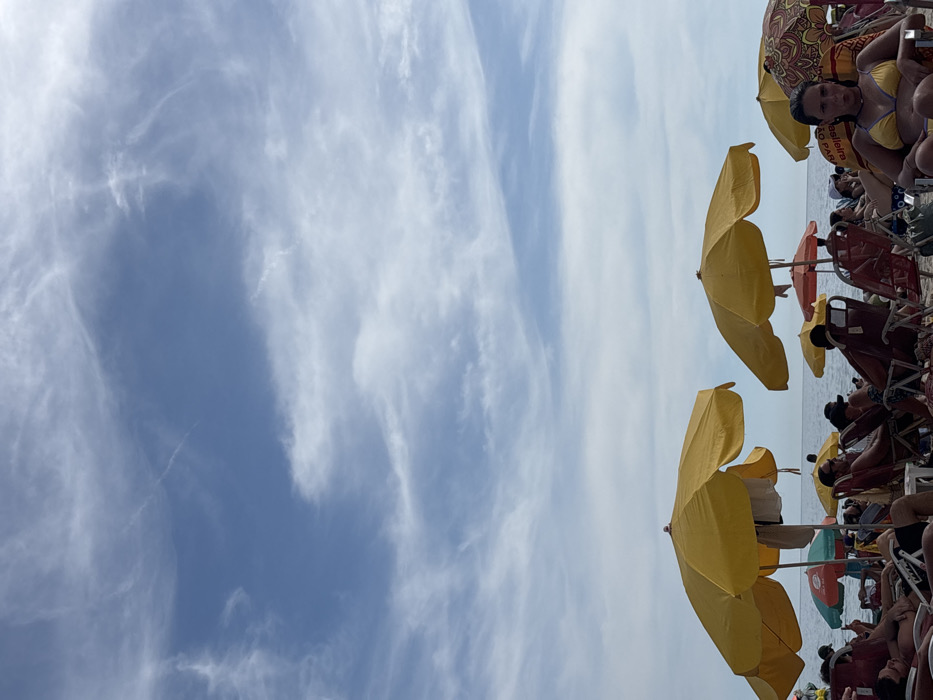 A vibrant beach scene unfolds under a bright, blue sky dotted with wispy clouds. Rows of colorful beach umbrellas, predominantly yellow, provide shade for sunbathers relaxing in their chairs. People are lounging, enjoying the warmth and the coastal ambiance. The turquoise sea is visible between the umbrellas, completing the idyllic image of a summer beach day.