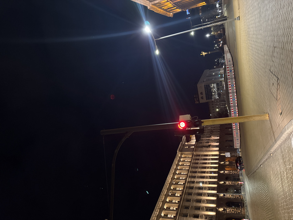 The image captures a nighttime street scene in the Largo area of central Sofia, Bulgaria, specifically featuring the Council of Ministers building on the left. The sky is dark, indicating a nighttime setting. To the left, the multi-story Council of Ministers building is prominently displayed, illuminated by numerous warm-toned lights highlighting its classical architectural facade, including columns, arches, and evenly spaced windows across multiple floors. The ground in front of the building and extending into the mid-ground consists of cobblestone pavement. In the center-right foreground, a yellow pole supports a traffic light, which is actively displaying a red signal. A pedestrian signal is also visible below it. Further to the right, a modern street lamp with a strong, vertical light flare illuminates the foreground pavement and the adjacent area. Another multi-story building, partially visible on the far right, also shows illuminated windows. A section of the street or square in the mid-ground is demarcated by a line of white and red plastic barriers. A single dark-colored sedan is observed driving on the cobblestone street to the left of these barriers. In the far distance, the outline of the Monument to Saint Sophia is faintly visible. The upper portion of the sky is dark, with a faint, circular red light source visible towards the upper middle. No individuals are visible in the scene.