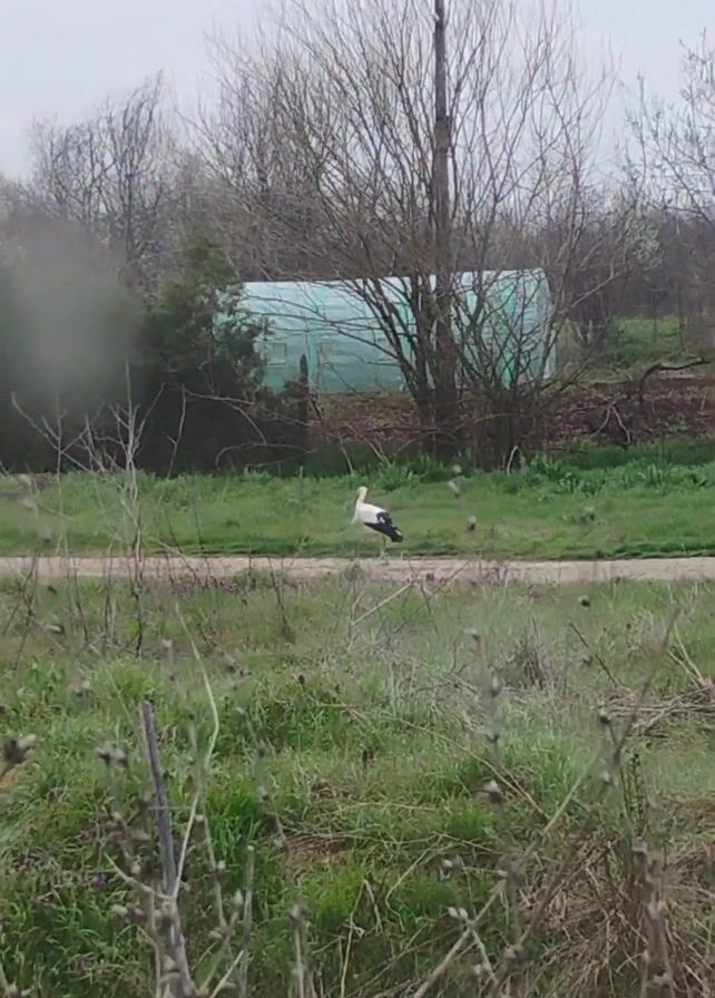 white stork with black wing feathers standing in a grassy area near a dirt road on an overcast day. The stork is positioned in the center of the frame. Behind it, on the other side of the road, is a field and a green structure that looks like a greenhouse. The background includes bare trees and bushes, suggesting it is late fall or early spring. The foreground is filled with dried vegetation and green grass. Light rain or mist is on the lens.