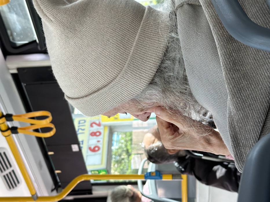 The image depicts the interior of a public bus in Bat Yam, Israel, with a view looking forward and to the right. In the immediate foreground, an elderly individual is seated, viewed from their right profile. They are wearing a light beige ribbed knit beanie and a matching light-colored, possibly ribbed, sweater. The individual has a prominent, long, grey beard, and visible wrinkles on their face. Their right hand is raised, with fingers touching their chin/mouth area. Above and to the left of the main subject, yellow overhead grab handles hang from a yellow horizontal pole, and a yellow vertical support pole is visible. A white air vent is mounted on the ceiling in the upper left. Through the bus window, an exterior urban scene is visible, dominated by a gas station sign displaying large red digital numbers "6.82", likely indicating a fuel price. Partially obscured Hebrew text is visible above these numbers, and green elements suggest a gas station brand. Green foliage from trees is present in the background outside the bus. Other passengers are partially visible in the background inside the bus; the back of a head is on the far left, and another head/shoulder is further back to the right.