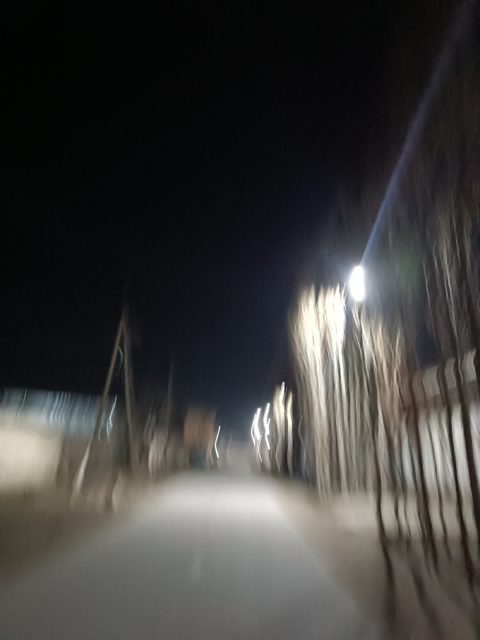A blurred nighttime street scene is captured with significant motion blur. Street lights illuminate a narrow road flanked by indistinct buildings or structures. Bare trees or poles line the right side of the street, their forms elongated by the camera's movement. The dark sky above contrasts with the illuminated road, creating a sense of depth. The overall image suggests a hurried or unsteady perspective.