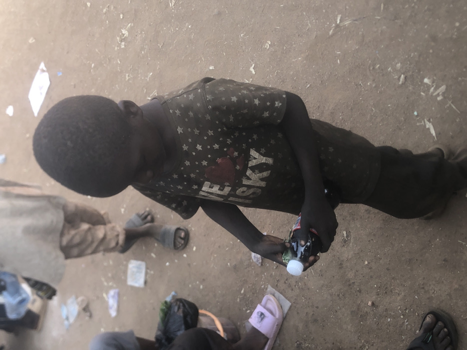 The scene depicts an outdoor environment with an unpaved, dusty ground scattered with debris, likely in Kufena, Nigeria. A young, dark-skinned child, estimated to be male, stands centrally, clad in a dark t-shirt adorned with white star patterns and the text "LOVE WHISKY" with a red heart graphic. The child is actively engaged in opening or manipulating the white cap of a small, dark-colored plastic bottle. Partially visible in the background and foreground are the lower extremities of at least two other individuals: one person wears beige trousers and dark slides, another wears dark pants and dark sandals, and a third wears pink slides. To the lower left, a dark plastic bag is contained within a light-colored bucket or container.