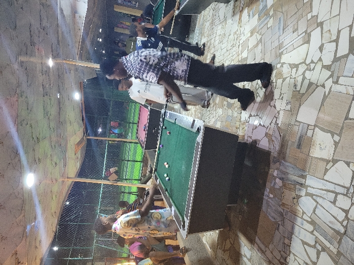 People play billiards on two tables in an outdoor venue. One table is green, while the other is red. There are several people watching and playing. The flooring is tan and white stone tile. The lighting is dim, with various fixtures placed overhead. The backdrop features a fenced area with greenery.