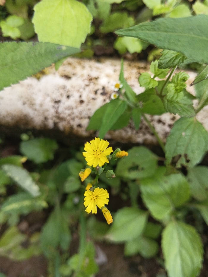 Two vibrant yellow flowers with jagged petals stand out amidst lush green foliage. Behind them, a weathered white surface with dark speckles creates a muted backdrop. Various green leaves, some rounded and some pointed, surround the flowers, contributing to the dense vegetation. A few tiny white flowers are also present, though less prominent. The composition is a close-up shot, focusing on the vivid colors and textures of the plant life.