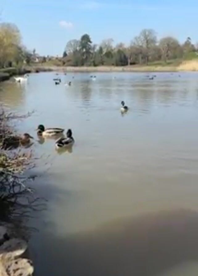 pond on a sunny day. Several ducks are swimming on the water's surface, some close to the bank. A swan is visible in the distance. The banks of the pond are lined with trees and reeds. The sky is blue with a few wispy clouds. A log structure can be seen at the edge of the pond.