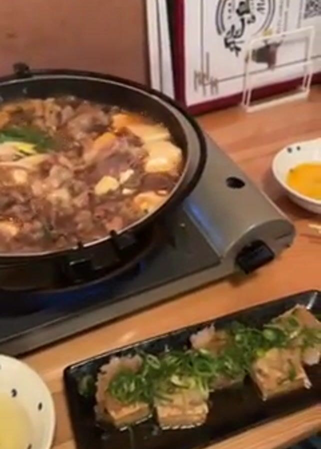 simmering pot of sukiyaki on a portable burner, with tofu dishes and a bowl of raw egg nearby on a wooden table. The sukiyaki contains beef, vegetables, and tofu in a broth. The camera zooms in on the sukiyaki, showing the steam rising from the pot. A menu is visible in the background.