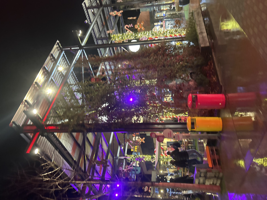 - "An urban outdoor space is decorated with Christmas lights and gingerbread figures hanging from metal structures" by FM-vVQbp1, licensed under CC BY 4.0