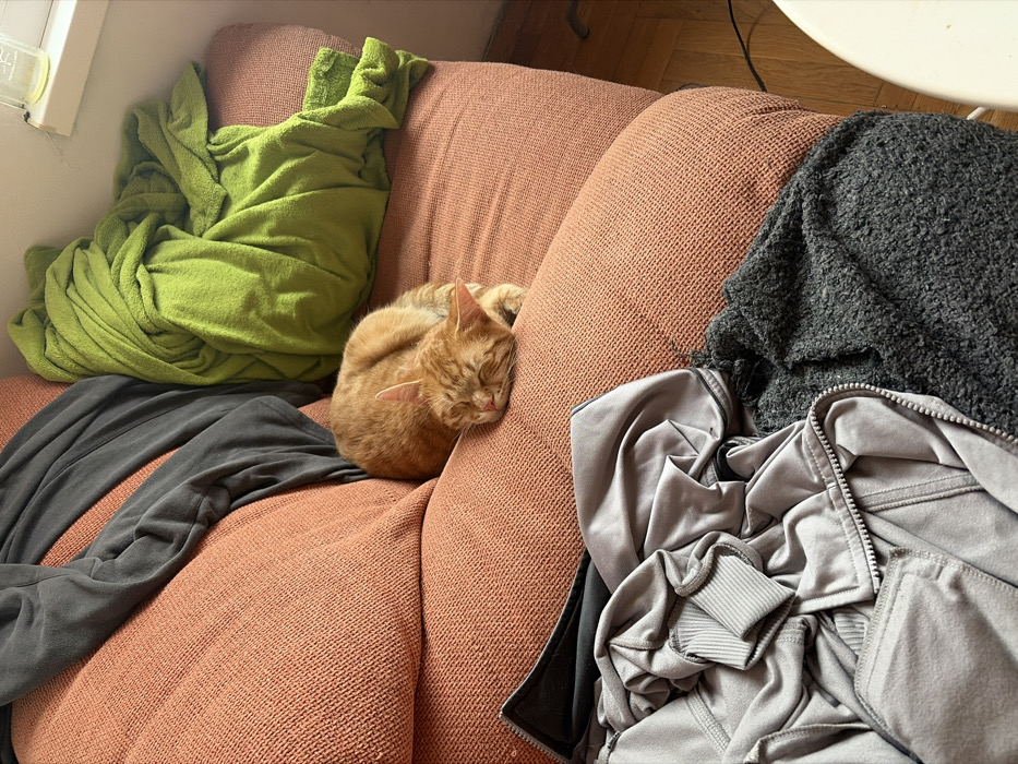 This indoor scene is located in Sofia, Bulgaria. An orange tabby cat is observed sleeping, curled into a tight ball on a textured, rust-orange sofa. Its eyes are closed, and its head rests on its paws. The sofa is partially covered with various items of clothing: a section of dark grey fabric is draped over the upper left portion of the sofa back, a crumpled bright lime green towel or blanket occupies the upper right side, and a pile of light grey sportswear, including a zippered garment, is situated in the lower left foreground. A dark grey, shaggy-textured garment or blanket is beneath the light grey sportswear. A window is partially visible on the upper right, admitting natural light. A translucent plastic bottle containing a yellow liquid is on the windowsill. Hardwood flooring is visible on the right side of the frame, adjacent to the sofa, with a thin black cable extending across it.
