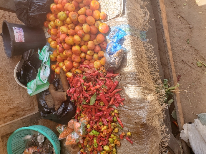 This image depicts an outdoor market stall in Jos, Nigeria, displaying various produce under natural light