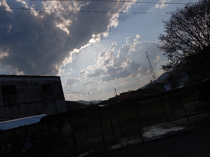 An overcast sky dominates the image, with dark clouds partially obscuring the sunlight, creating dramatic light rays. In the foreground, a dark building with visible windows is on the left. A fence or structure with vertical bars extends across the center. In the background, distant hills or mountains are visible. A tall transmission tower stands out on the right, partially obscured by trees. The overall scene conveys a sense of gloominess with patches of sunlight breaking through.