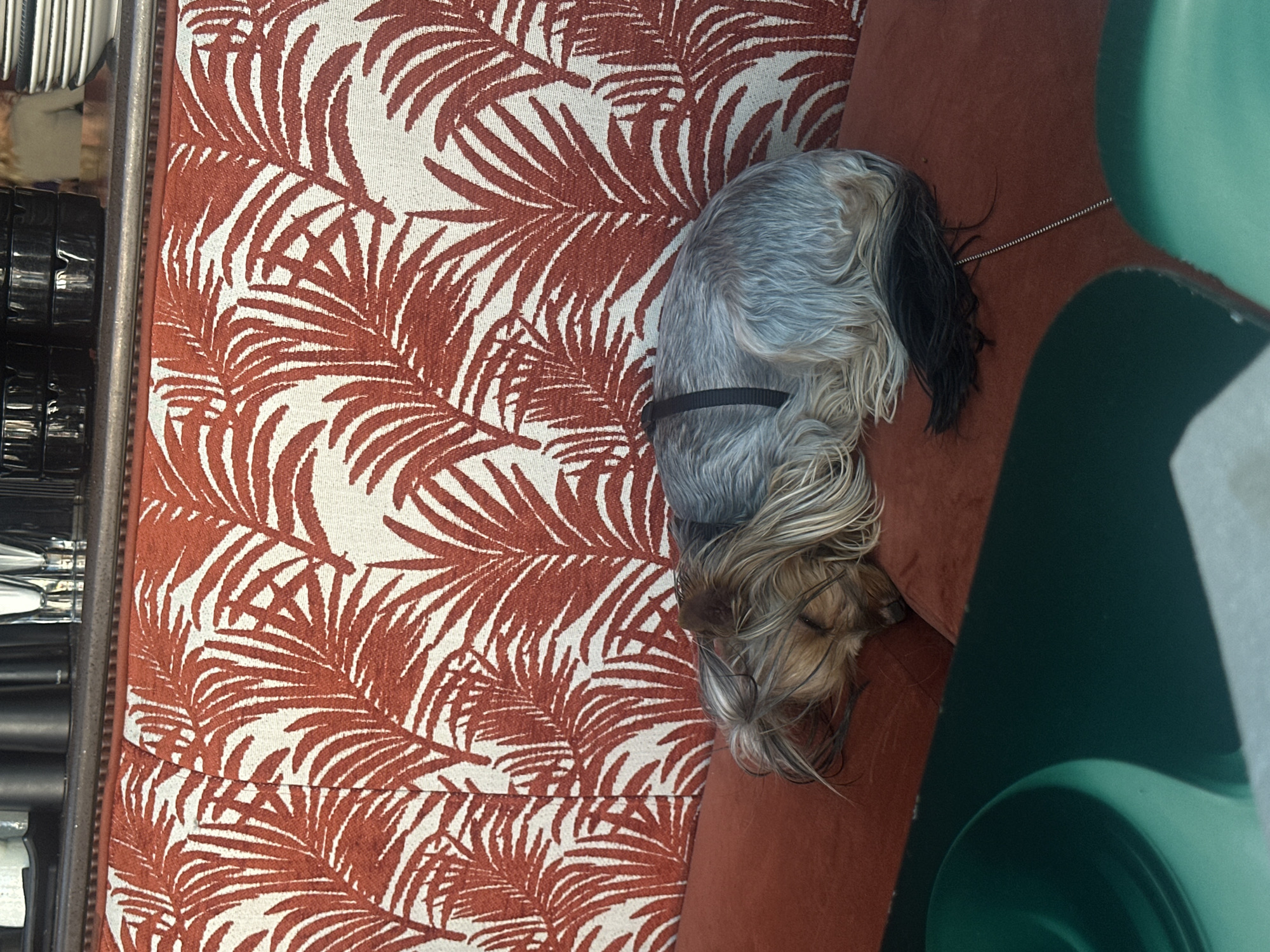 - "A medium-sized grey and black Yorkshire Terrier with a black collar lies sleeping on an orange couch" by FM-uXJaB3, licensed under CC BY 4.0