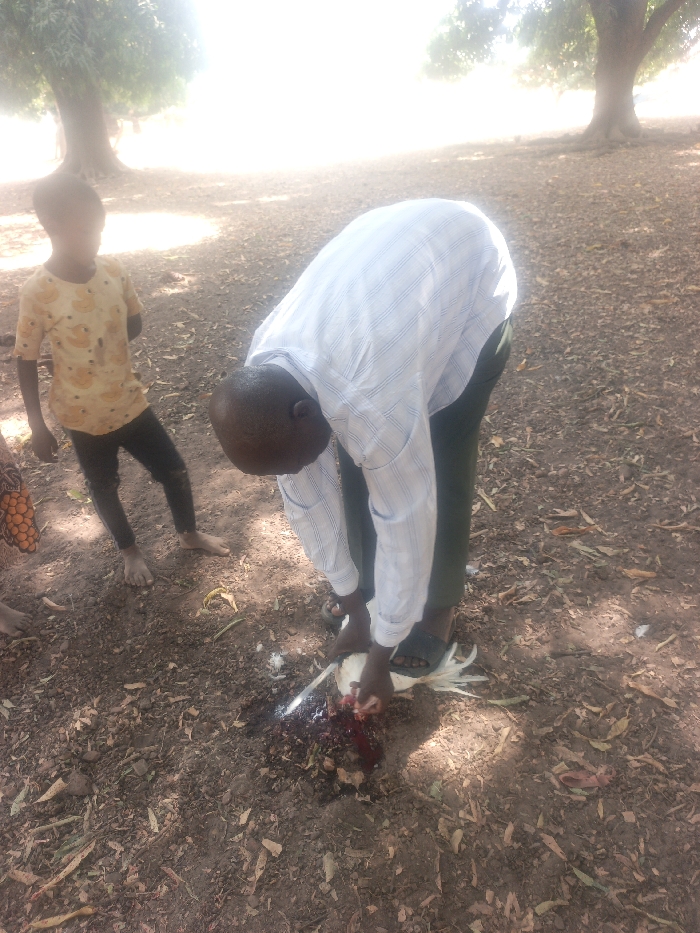 The scene is set outdoors on dry, reddish-brown earth in Akwanga, Nigeria. An adult male, dark-skinned, wears a light blue and white striped long-sleeved shirt, dark green trousers, and black sandals. He is bent over, actively butchering a white domestic fowl. His hands manipulate the bird's head and neck area, from which a significant pool of dark red liquid, consistent with blood, has collected on the ground. A metallic blade is visible near the fowl's neck. To the left, a young, dark-skinned child, barefoot and wearing a yellow patterned short-sleeved shirt and dark trousers, stands observing the activity. A partial view of another individual's leg is present on the far left. The background consists of more dry earth and several large trees under bright daylight conditions.
