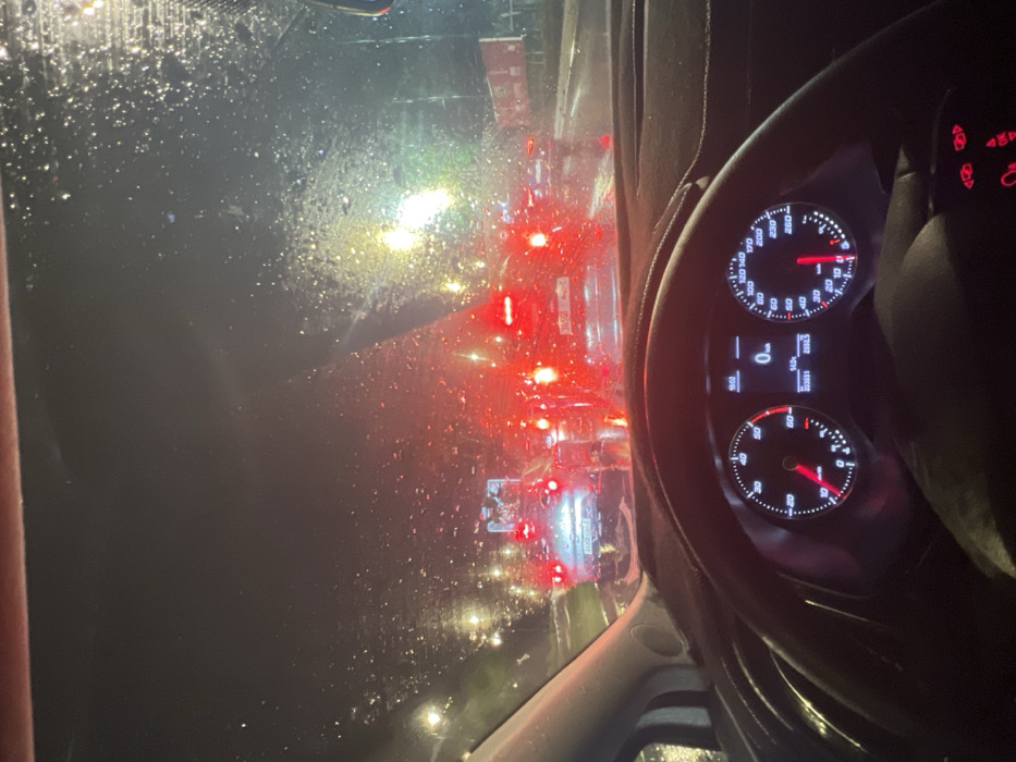 car interior at night, with the dashboard and steering wheel in the foreground. The speedometer reads zero. Outside, visible through the rain-streaked windshield, there is a traffic jam, with numerous red taillights and headlights illuminating the wet road. The overall scene suggests stationary traffic in poor weather conditions.