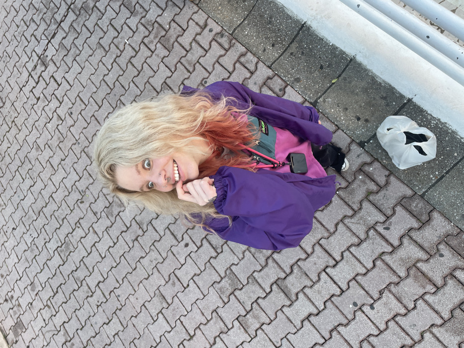 An overhead photograph depicts a single individual standing on a paved surface in Herceg Novi, Montenegro. The subject, a person with blonde, wavy hair featuring reddish-pink tips, is positioned centrally in the frame, looking directly upwards towards the camera with a wide-eyed, smiling expression. Their mouth is open, revealing teeth, and their right hand is raised, with fingers touching the area around their mouth. Facial piercings include a septum ring and a nostril stud on the left side. The individual wears a loose-fitting purple jacket over a pink and teal/green color-block top. A black case, possibly for wireless headphones, hangs from a pink lanyard around their neck. Dark trousers and dark sneakers with white soles are partially visible. The ground is paved with interlocking grey pavers arranged in a diagonal pattern. A dark grey concrete curb with a white painted line runs along the right side of the frame, separating the paved area from another section of pavement. A light-colored horizontal railing is visible in the lower right corner, parallel to the curb. A translucent white plastic bag containing dark material rests on the ground next to the curb in the lower right. The lighting suggests ambient daylight.