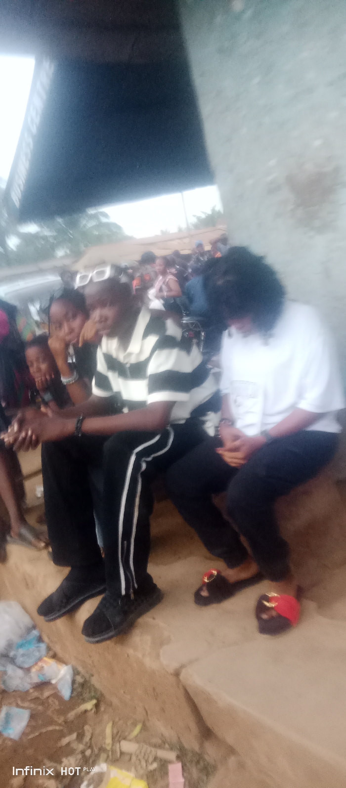 A group of people are sitting on a concrete structure. Two individuals are in the foreground, one wearing a striped shirt and black pants with a white stripe, and the other in a white shirt and dark pants with red slippers. Other people are gathered in the background, partially obscured. A sign reads "BUSINESS CENTRE". Litter is visible on the ground.