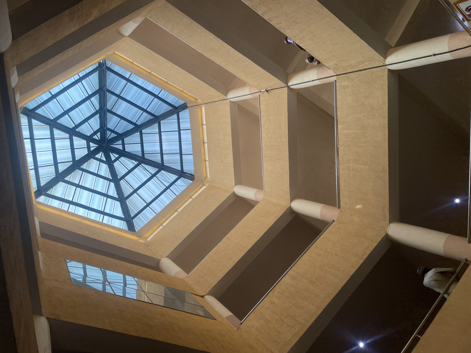 The image depicts an upward view within the multi-story atrium of a building in Jos, Nigeria. An octagonal skylight, composed of a dark-framed grid holding blue-tinted transparent panels, forms the ceiling. The atrium walls are textured light brown/beige, featuring multiple recessed balcony levels. Rounded columns, painted light pink and white, support these levels. Silver metal railings are installed along the balcony edges. A thin, dark vertical cable or rod descends from the upper structure. On a lower-left balcony, a single individual, wearing a light-colored garment and head covering, is partially visible from behind, facing away from the camera. On a higher balcony to the right, two additional individuals are partially visible, one wearing a purple head covering. Bright, circular reflections from artificial light sources are present on the lower walls. Natural light from the skylight illuminates the upper sections, while lower levels appear darker.