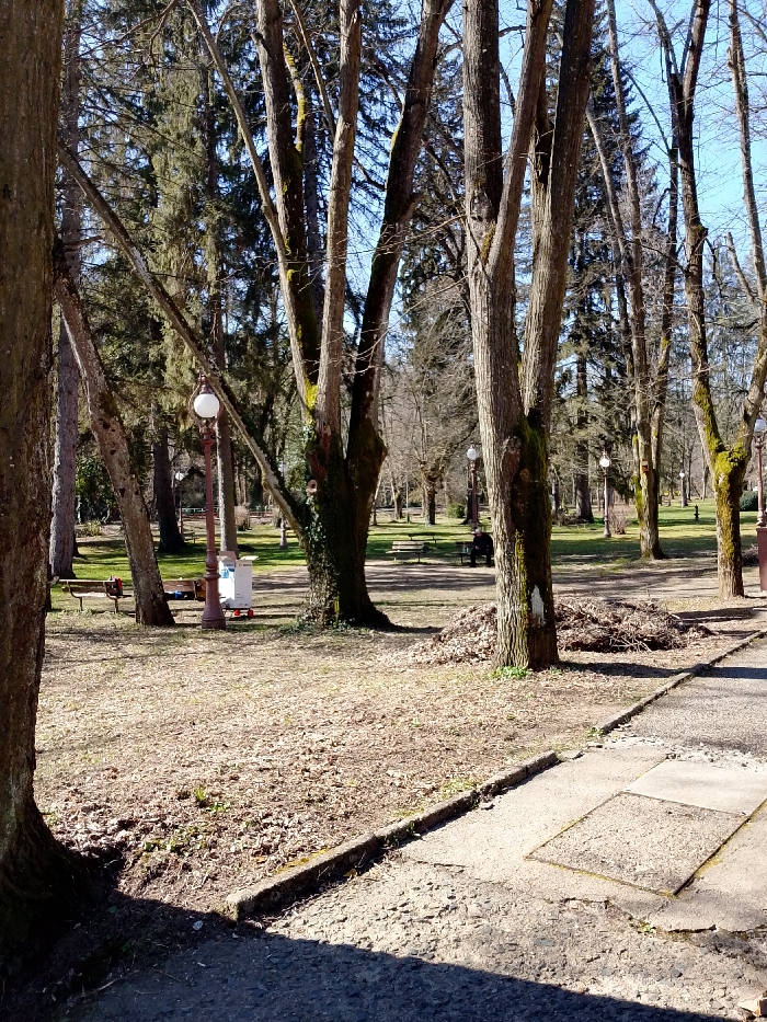 A daylight, outdoor scene depicts a public park in Unknown, Unknown, under clear blue skies. The ground is primarily covered with dry, fallen deciduous leaves and sparse patches of grass, indicative of late winter or early spring. Numerous mature deciduous trees with bare branches, some exhibiting moss or lichen growth on their bark, dominate the view, intermingled with taller coniferous trees in the background. In the foreground, a paved asphalt pathway, showing signs of wear with broken sections and containing a rectangular metal access cover, runs along the bottom right, bordered by a concrete curb. A large tree trunk is partially visible on the far left. In the mid-ground, a dark-colored, vintage-style street lamp with a white spherical globe is positioned to the left of a central cluster of trees. Adjacent to the lamp, a white rectangular unit, resembling a small refrigerator or cooler, rests on a red-wheeled dolly. To the right of the central trees, a pile of raked organic debris, composed of leaves and small branches, is present. Multiple park benches are distributed throughout the scene; a brown bench is partially visible on the left, and a lighter-colored bench is situated further back on the right. One individual, dressed in dark clothing, is seated on the lighter-colored park bench in the mid-background, facing towards the left. No other individuals or active interactions are observed. Bright sunlight casts distinct shadows across the ground and objects.