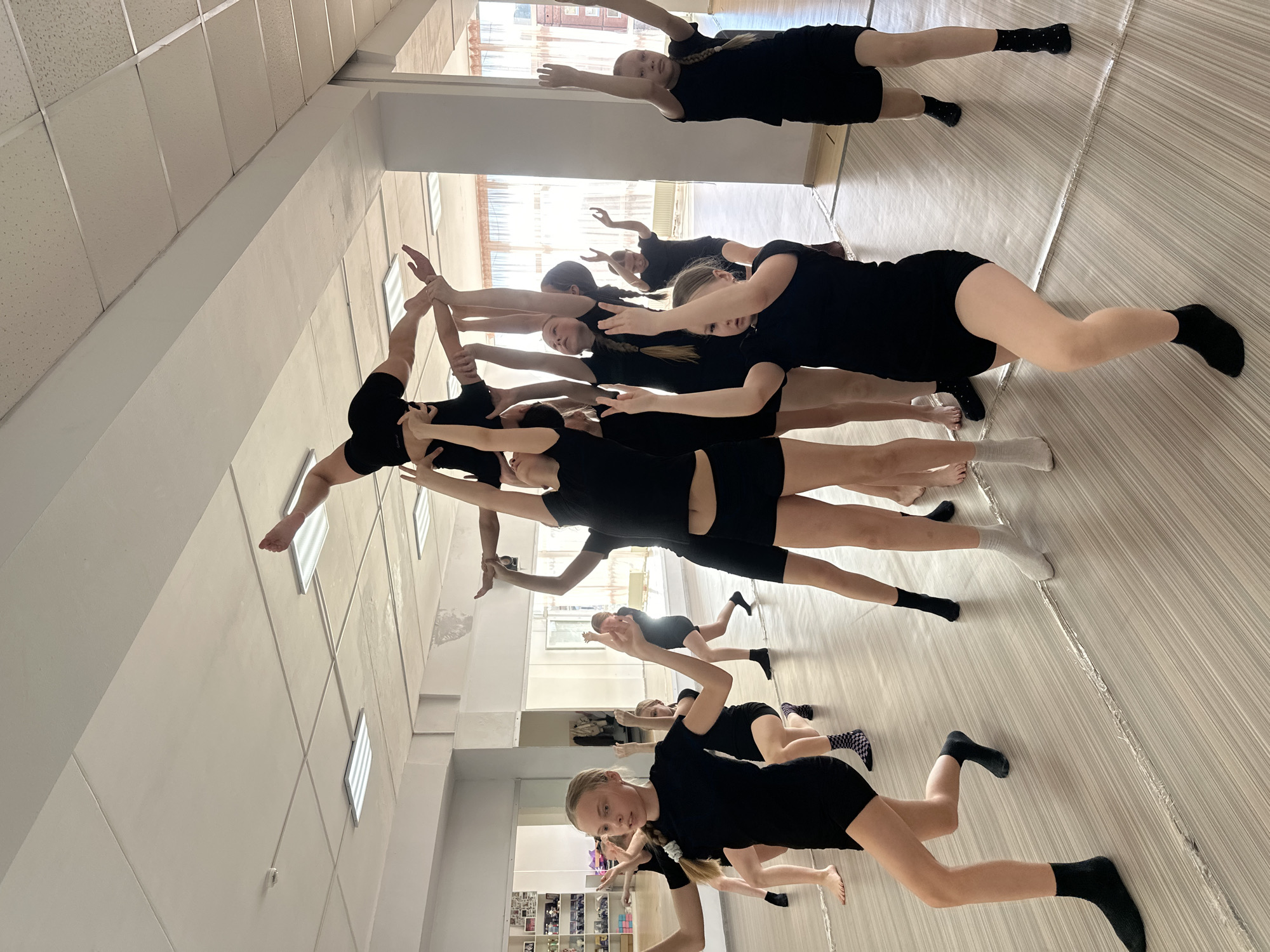 The image depicts a dance or gymnastics studio located in Votkinsk, Russia. Approximately fifteen young females, likely pre-teen to early teen, are engaged in a practice session. The central action features a group forming a human pyramid, with one individual in black athletic shorts and shirt positioned horizontally, suspended overhead, supported by the uplifted arms and hands of multiple peers below. In the foreground left, a female with blonde hair tied back is captured mid-movement, in a low lunge with arms extended outward, wearing black socks. Other participants are scattered throughout the mirrored studio, mostly clad in black short-sleeved tops and black athletic shorts. Several individuals are in various dynamic poses: some with arms raised overhead, some in lunges, and others poised for movement. Footwear varies among them, with some wearing black, white, or patterned socks, and others appearing barefoot. The studio environment features a light-colored, reflective floor with visible seams, likely a dance-specific surface. The walls are plain white, and large mirrors cover significant portions, reflecting the activity and studio space. In the background right, large windows with light-colored curtains overlook an urban setting. The ceiling is a white suspended tile grid with multiple rectangular fluorescent light fixtures providing illumination. A shelving unit filled with various objects is partially visible through an opening on the far left wall.