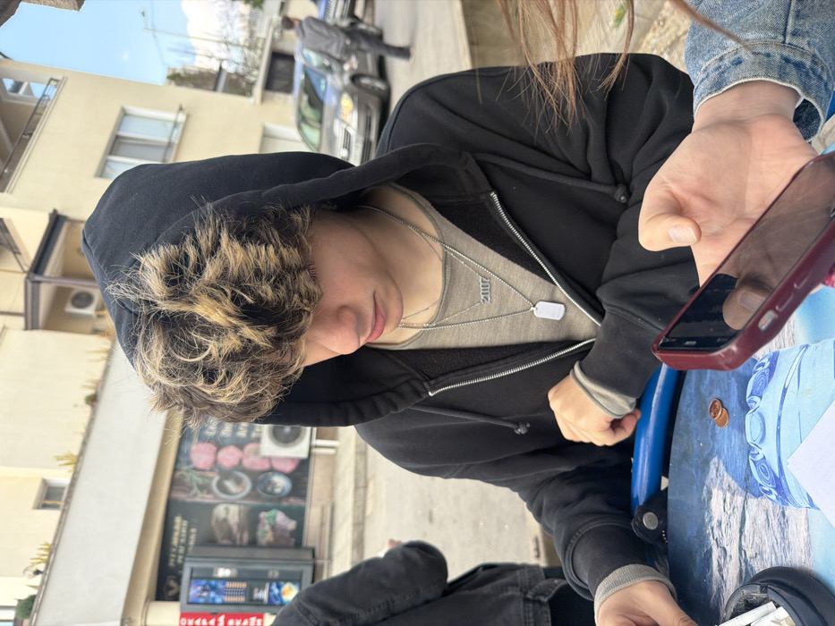 The image depicts an outdoor urban scene in Stara Zagora, Bulgaria, focusing on three individuals. In the foreground and midground, a young individual with messy, dark hair featuring prominent blonde highlights, wears a black hooded sweatshirt (hood up) over a grey long-sleeved shirt. Two silver necklaces are visible: one with a "2007" pendant and another with a plain rectangular dog-tag style pendant. This individual is seated at a table, looking downwards, with their right hand resting on a blue surface. Their left hand is partially visible near an ashtray containing several cigarette butts. On the blue-patterned tabletop, two copper-colored coins, a partially visible clear plastic water bottle, and a white folded paper are present. In the lower right foreground, the hands of a second person are visible, holding a maroon smartphone with a thumb resting on the screen. A denim jacket or shirt is visible on this person. A third blurred individual, wearing a grey hooded sweatshirt, is seen walking away in the distant right background on a paved street. The background on the left features a dark vending machine adjacent to a storefront with a dark sign displaying Cyrillic script, a bird-like logo, and images of various food items. A white air conditioning unit is mounted on the wall below the sign. The right background reveals a light-colored multi-story building with windows and balconies, also featuring a mounted air conditioning unit. Several grey sedans are parked along the street. The sky is partly cloudy.