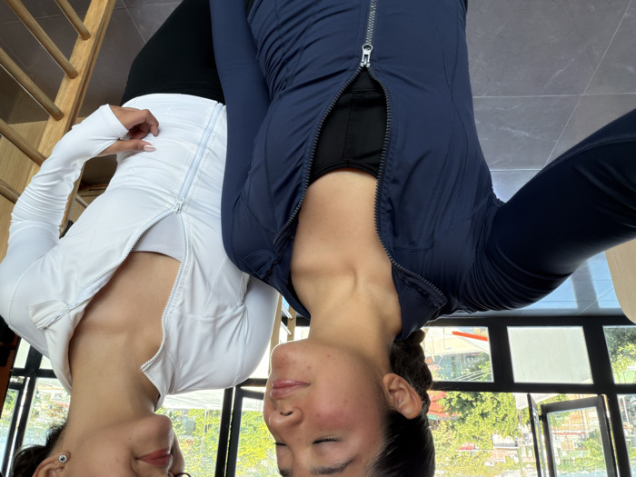 Two women are standing upside down, backs touching