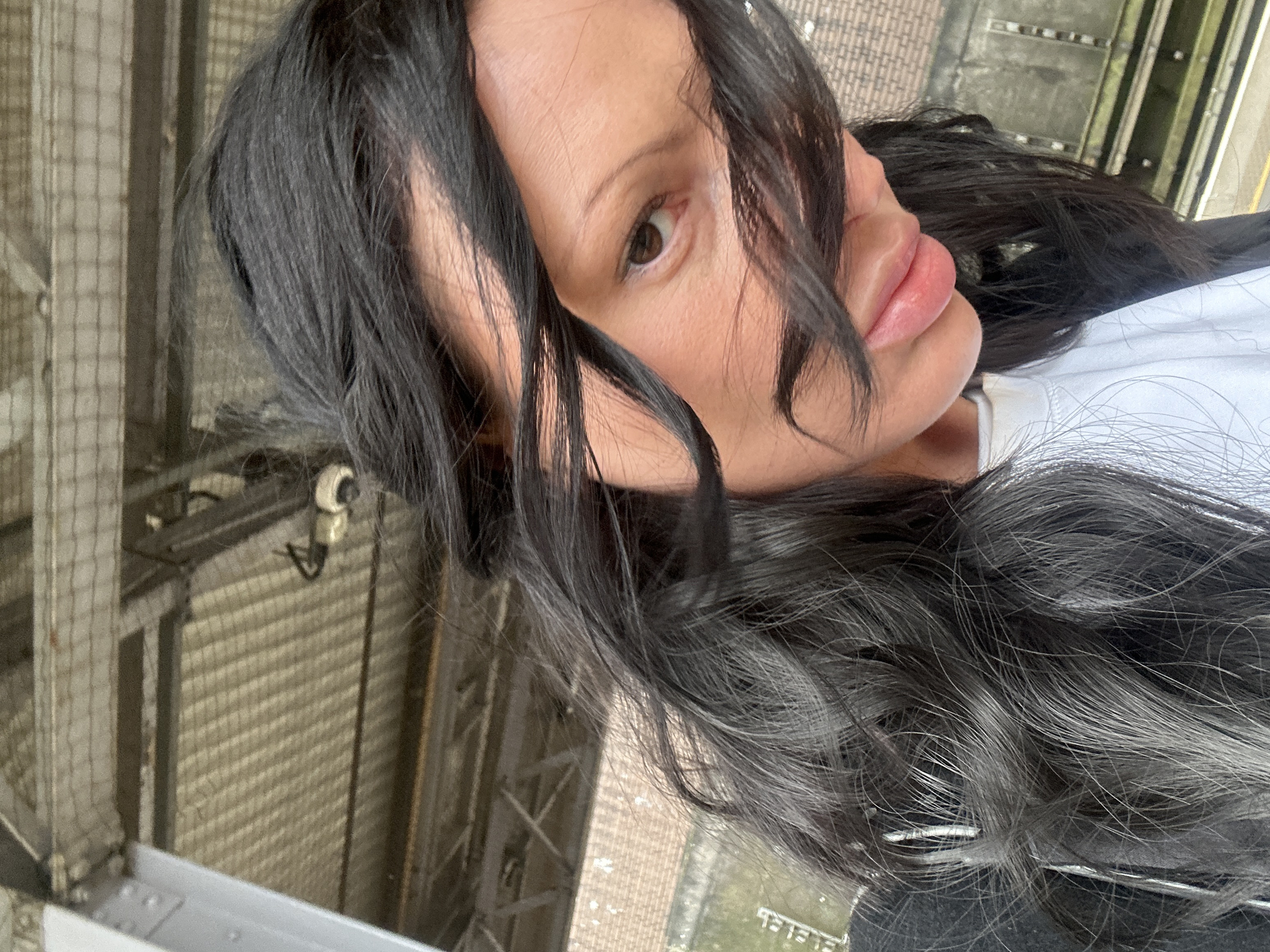 The image displays a close-up, angled perspective of a female individual captured at a railway station. The subject's dark, wavy hair, with visible grey strands, cascades across her face, partially obscuring the left side and her upper lip. Her right eye is visible, dark brown in color, alongside her nose and full, pink lips. Her skin tone is medium. She is wearing a white garment beneath a dark outer layer. The background reveals the station's architecture, including a beige corrugated roof structure supported by metal beams and girders, with a white CCTV camera mounted overhead. Below the roofline, train tracks are visible, and across the tracks, a wall constructed of reddish-brown bricks is present. This environment, including the distinctive roof and brickwork, is consistent with Tonbridge Railway Station, situated in Tonbridge, within the Tonbridge and Malling borough, United Kingdom.