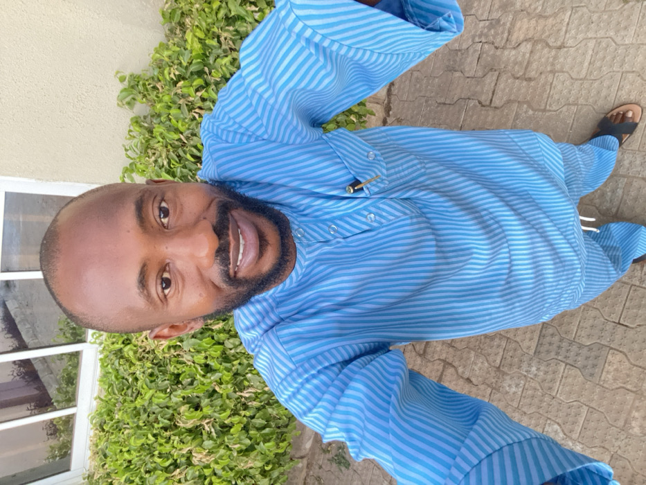 A smiling man poses outdoors in a light blue, striped, long-sleeved outfit. He stands near a wall with climbing green foliage and a window. A paved surface with a brick-like pattern is visible. His dark beard is neatly trimmed. He is wearing dark sandals.