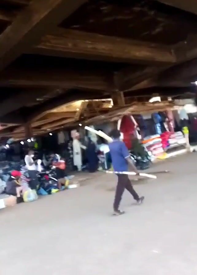 man carrying two white poles walking in a market located under a bridge. The bridge's structure is visible overhead. The market is bustling with people browsing through various stalls selling clothing, bags, and other items. The market appears to be outdoors, with natural light filtering in from the ends of the bridge.