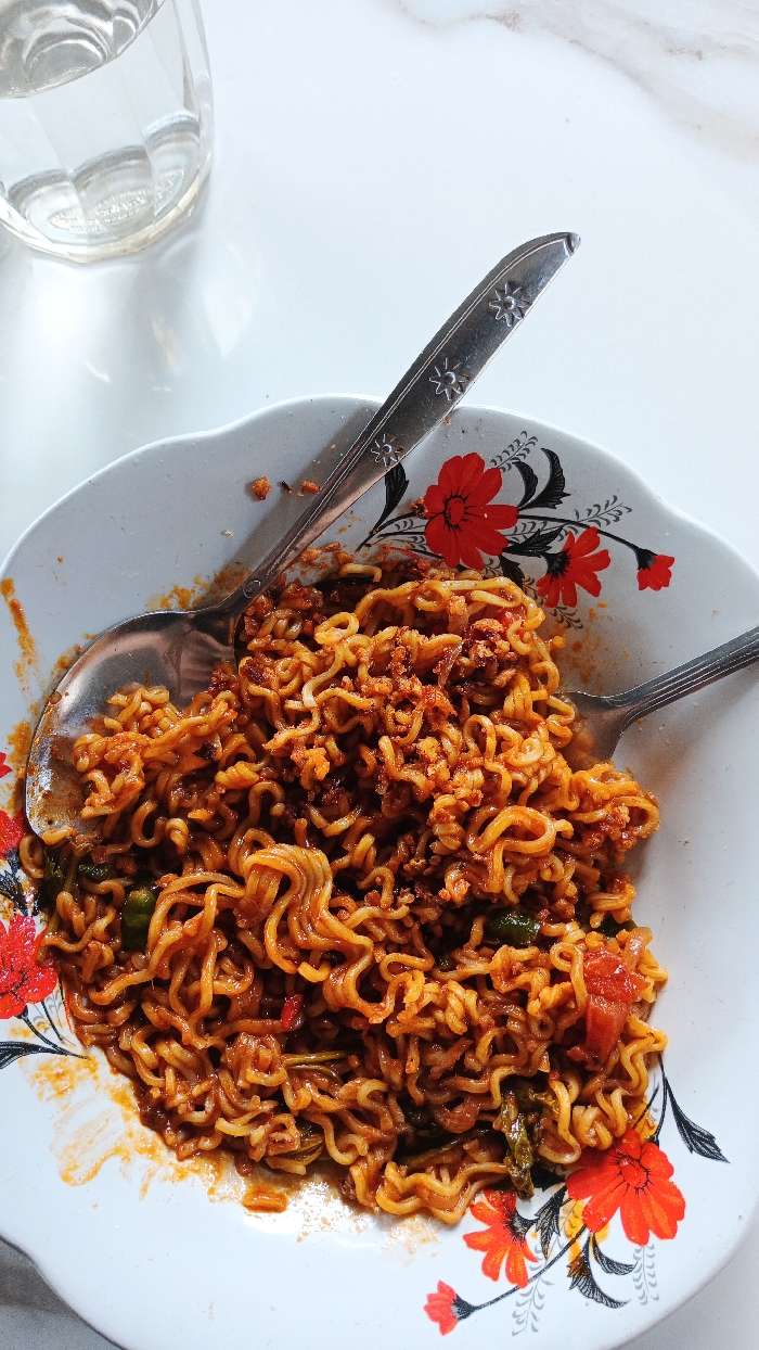 A plate of dark brown noodles with red and green vegetables sits on a white surface. Two silver utensils are partially visible, a spoon and a fork. The plate has a floral pattern with red and black flowers. A glass of clear liquid is in the upper left corner. The noodles appear to be heavily sauced and possibly contain ground meat. The lighting is bright, suggesting a daytime setting.
