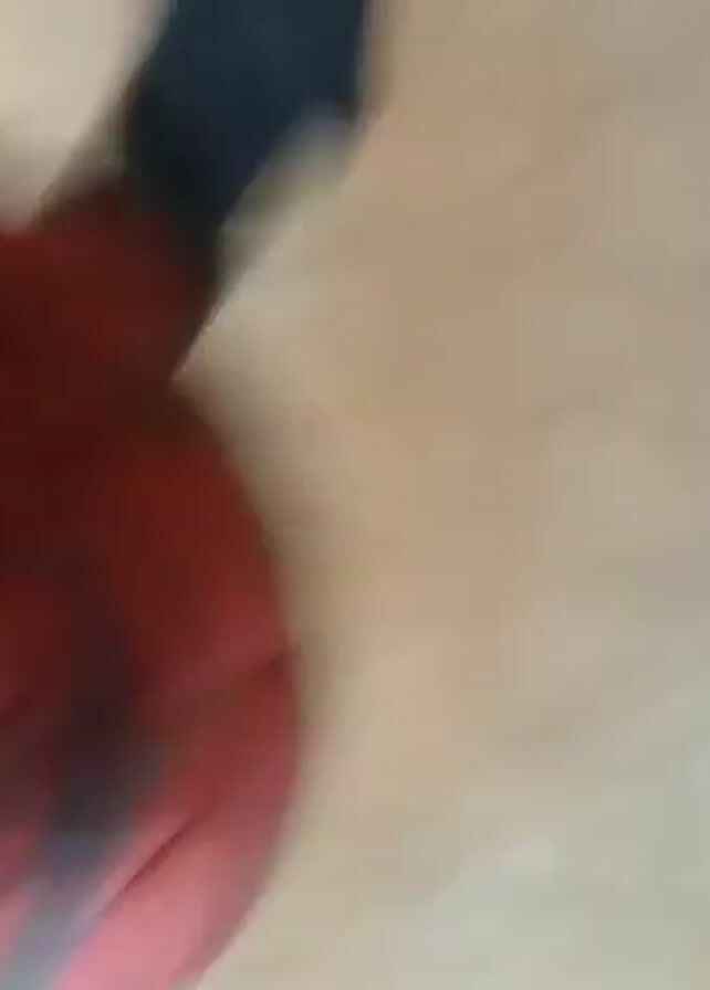 person bouncing a red ball on a tiled floor in a room with peeling paint on the walls. The camera angle is low, looking up at the person and the wall. The person is wearing what appears to be a red garment. The tiles are a light, creamy color and there are dark brown objects visible in the background. The video is shaky, likely due to the camera being held by the person bouncing the ball.