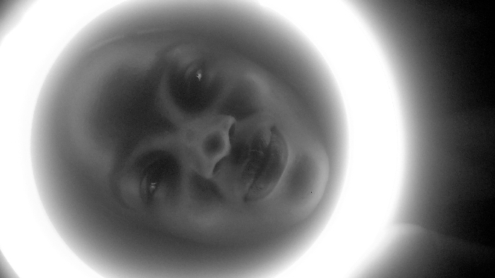 A black and white, high-contrast close-up portrait of an individual, located in an unidentifiable setting within Narayi, Nigeria. The subject's face is centrally positioned, directly facing the camera. Intense circular illumination from a ring light encircles the face, creating a prominent halo effect and rendering skin tones with significant inversion and high contrast; brighter areas of the face appear light grey to white, while shadowed areas are deep grey to black. The individual maintains direct eye contact with the viewer, and the lips show a slight upturn consistent with a subtle smile. Reflections from the light source are visible in the subject's eyes. The upper portion of the head and areas below the chin fade into darkness, with no discernible background elements.