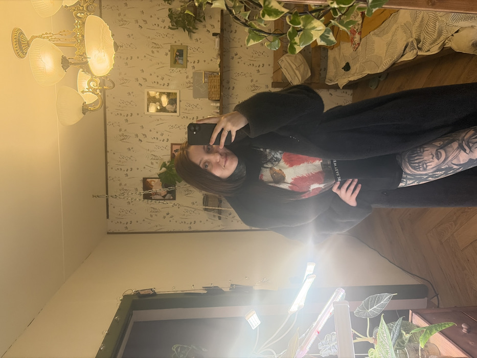 A woman with long brown hair takes a selfie in a mirror. She's wearing a black coat and a t-shirt with a design on it. Part of her arm tattoo is visible. In the background, the room has patterned wallpaper with framed pictures. A chandelier hangs from the ceiling. A plant is visible near the top of the mirror. Near the bottom, another plant is near a window with a grow light.