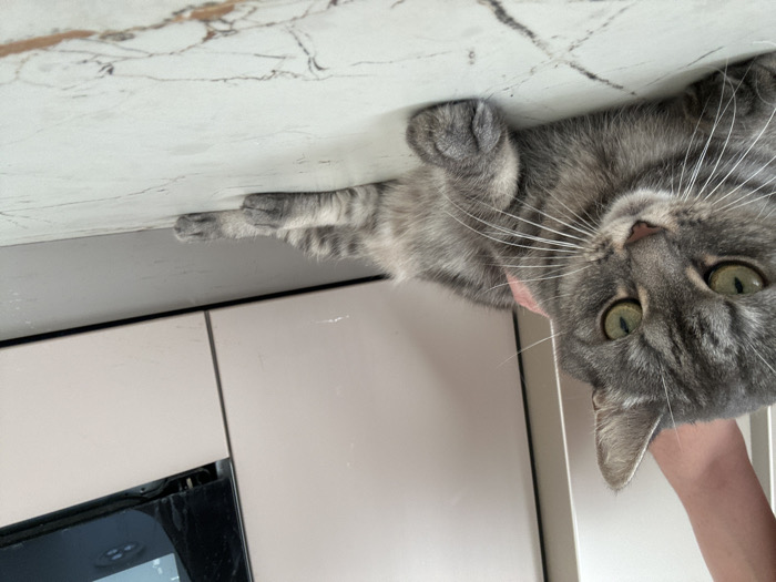 - "A gray tabby cat is upside down on a marble countertop, with its paws dangling over the edge" by FM-eEmkS2, licensed under CC BY 4.0