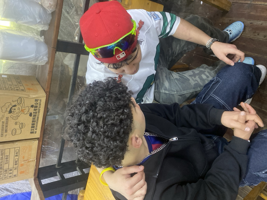 This image depicts two individuals in a casual indoor or semi-enclosed commercial setting, located in the Chongqing High-tech Zone, China. The individual on the left is viewed from behind and the side, possessing dark, tightly curled hair. They are wearing a black zippered hooded jacket over a garment with visible red and blue stripes near the neck, dark blue cargo pants, a silver-colored chain necklace, and a yellow wristband on their left arm. Their hands are clasped together in their lap, and their gaze is directed downwards towards the second individual. The individual on the right is observed from above and the side, wearing a red baseball cap with a white logo and reflective, neon-green framed sports sunglasses pushed onto the cap's brim. They wear a white t-shirt with green stripes and a visible "5" on the right sleeve, resembling a sports jersey, along with camouflage-patterned pants, a silver-colored bracelet on their left wrist, and light blue and white sneakers. This person is leaning or crouching, positioned closely to the left individual, with their left arm draped over the left individual's shoulder, and looking towards them. The background features a wooden shelf holding two cardboard boxes. The box on the left has Chinese characters including "生产日期" (production date) and "合格证" (certificate of conformity). The box on the right displays a cartoon chef image and includes the visible Chinese text "遂宁顺达塑料制品有限公司" (Suining Sunda Plastic Products Co., Ltd.), identifying it as a plastic products manufacturer. Various items wrapped in clear plastic bags are also visible on the shelf and in the background. The floor consists of wooden planks.