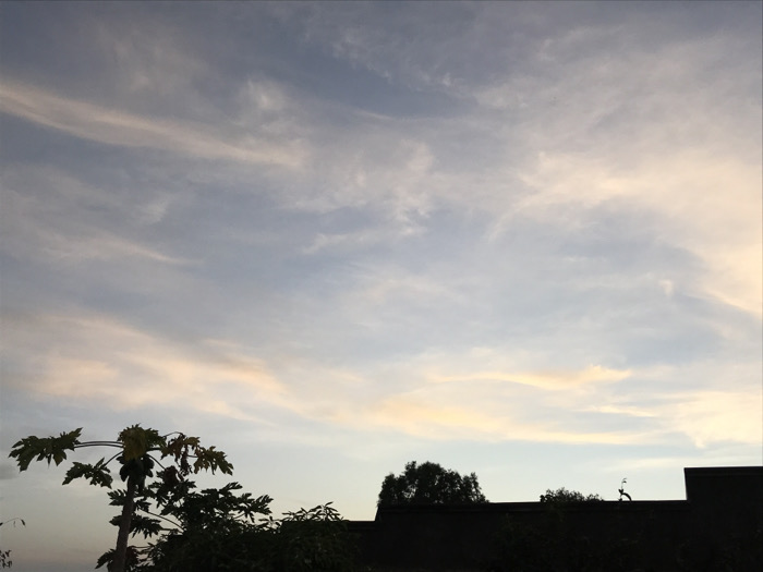A serene sky filled with elongated clouds stretches across the upper portion of the image. The clouds are tinted with soft hues of pink and blue, suggesting either sunrise or sunset. In the lower section, silhouetted trees and vegetation form a darker, contrasting band. A tall, slender tree with distinct leaves is visible on the left. A solid wall with a small section extending upwards is on the right, further defining the horizon.