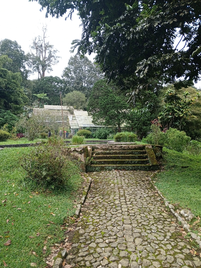 A cobblestone path leads to a set of weathered concrete steps, ascending towards a large greenhouse structure with a peaked roof