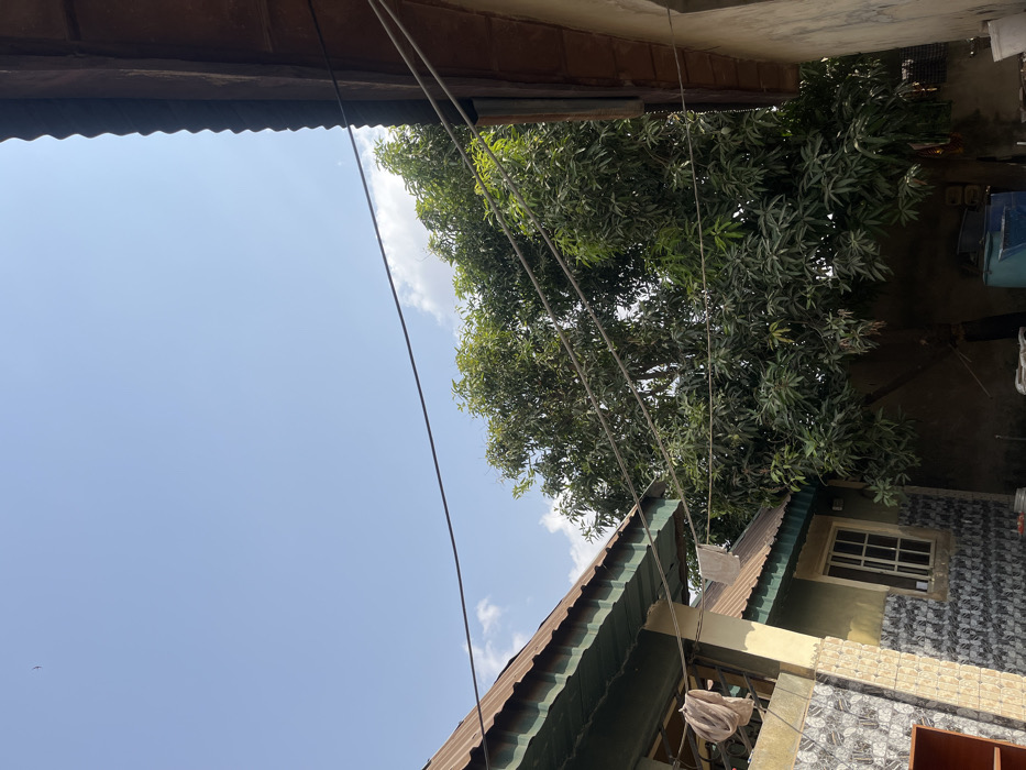 This image presents an outdoor residential area in Ado, Nigeria, observed on a bright, sunny day under a predominantly clear blue sky with minimal scattered white clouds