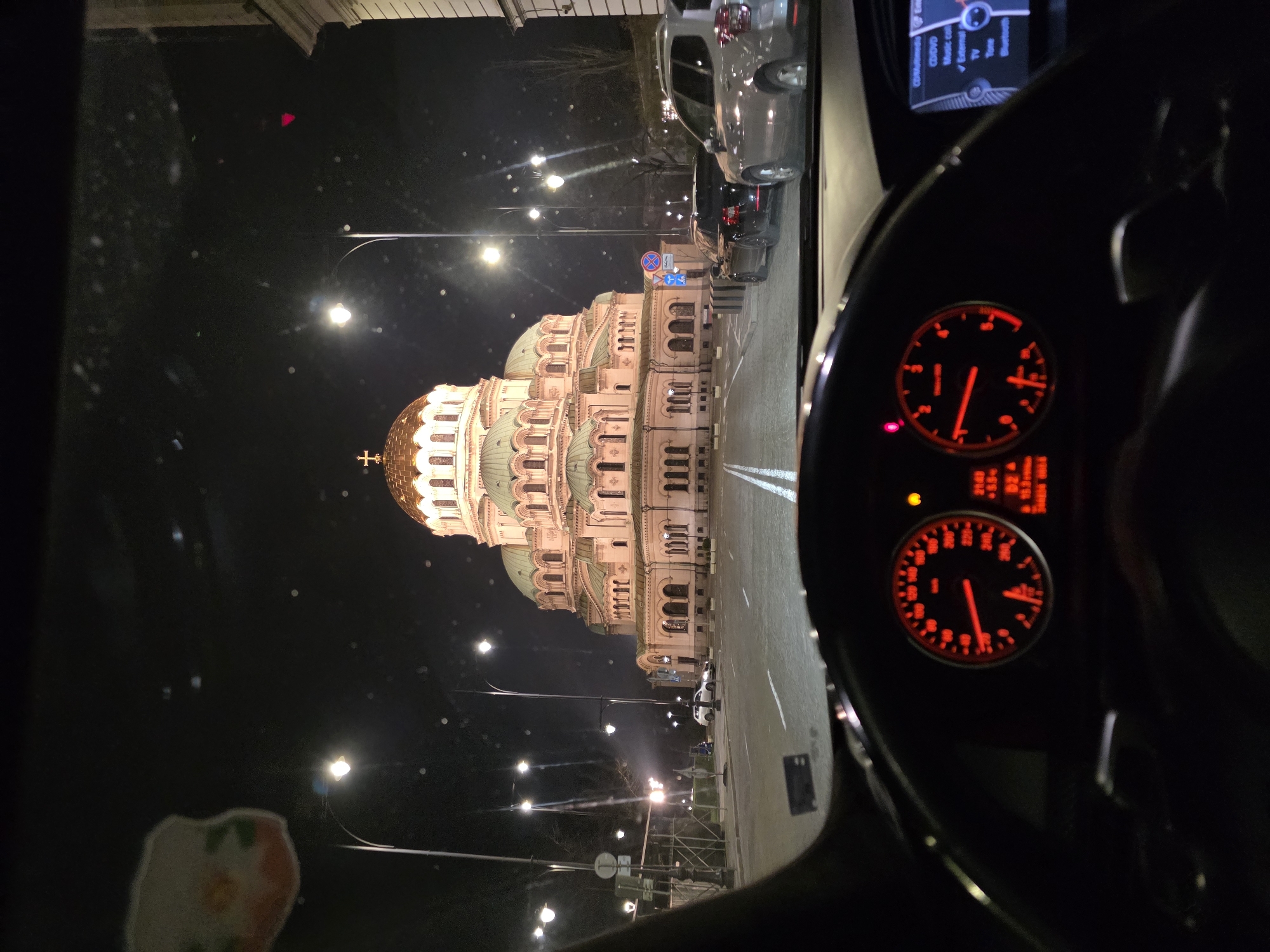 Alexander Nevsky Cathedral in Sofia, Bulgaria, as seen from the interior of a car at night. The dashboard is visible, with red-lit gauges. Several cars are parked along the street next to the cathedral. Streetlights illuminate the area.