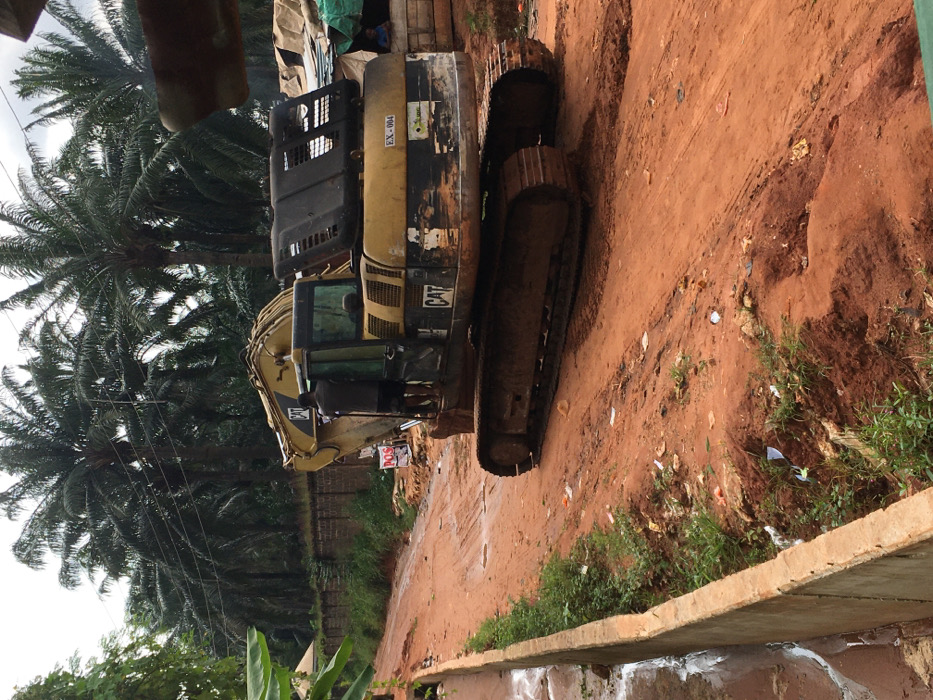 The image presents a Caterpillar (CAT) tracked excavator, model EX-004, positioned on a reddish-brown dirt road in Nkpor, Nigeria