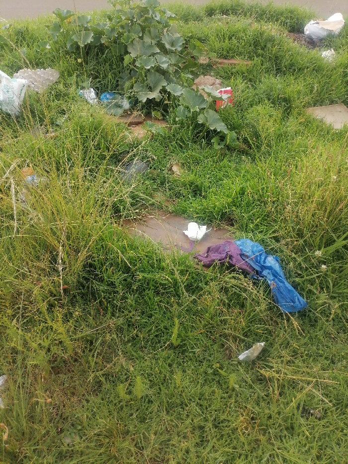 Lush green grass and weeds cover a landscape littered with trash. Plastic bags, paper, and other debris are scattered throughout the scene, some near a puddle of water. A cluster of broad-leafed plants grows towards the top of the frame, amidst the untidy environment. The scene reflects neglect.