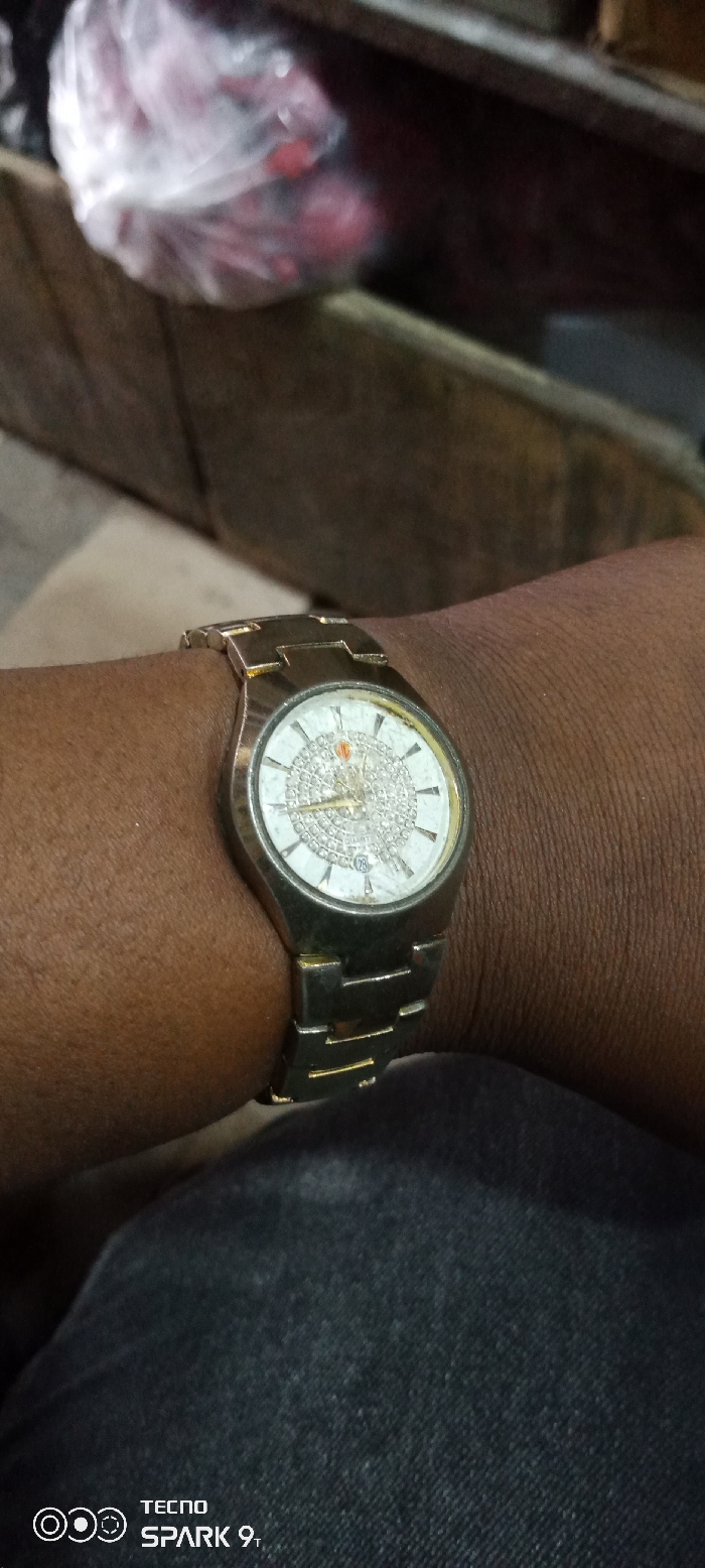 A close-up photograph captures the dark-skinned forearm and wrist of an individual wearing a gold-toned metallic wristwatch with a matching link bracelet