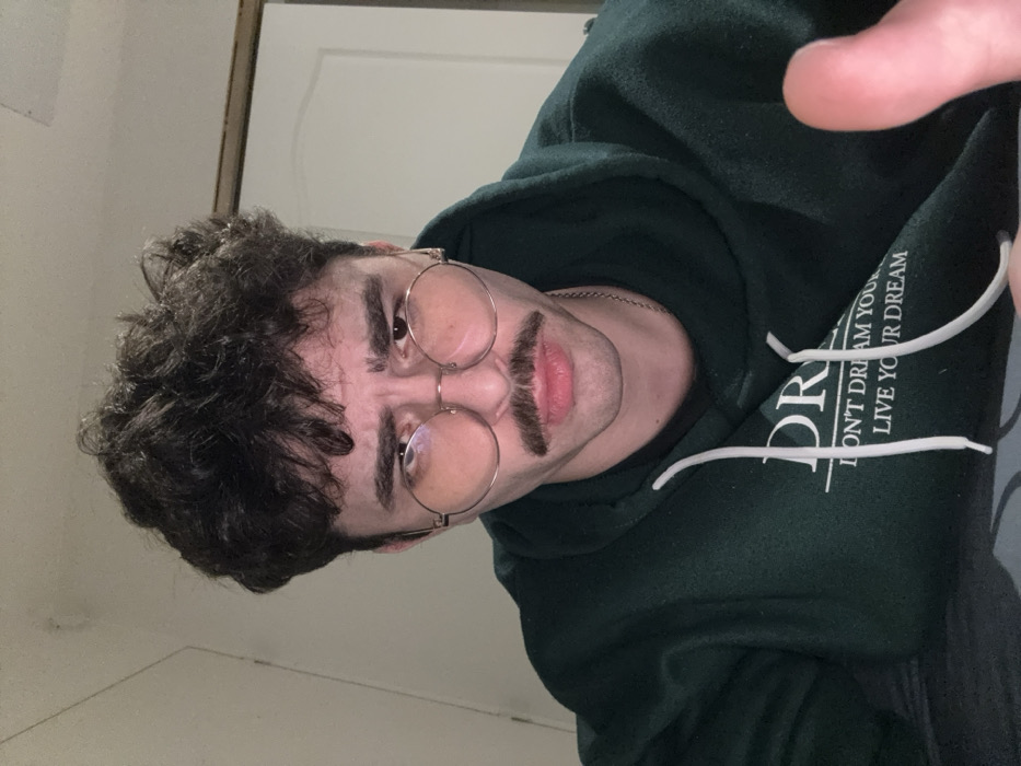 A man poses in a dark green hoodie with white drawstrings and printed text, "DON'T DREAM YOUR LIFE LIVE YOUR DREAM," visible on the upper left. He wears round, gold-rimmed glasses and a dark, narrow mustache. His dark, curly hair is slightly tousled. His right hand is held up, with only the thumb and part of the index finger in the frame. The background includes a light-colored wall and a white door with a dark frame. The image is tilted slightly to the left.