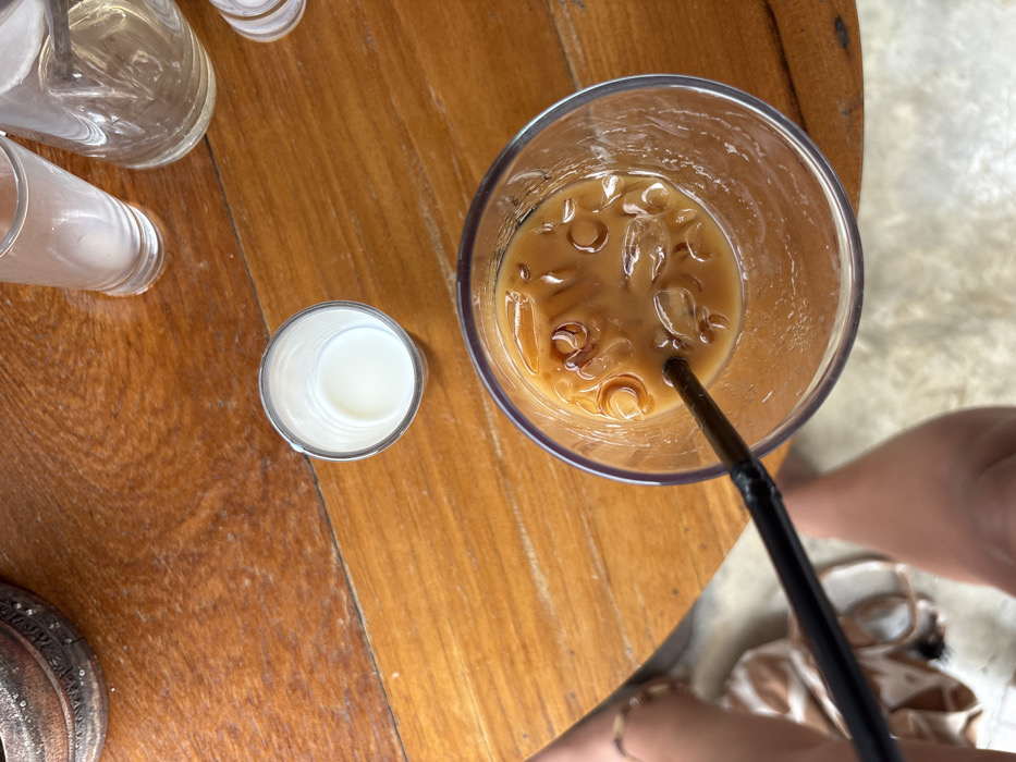 A top-down shot shows a wooden table with various drink containers. A glass holds a tan-colored iced coffee with a black straw. Beside it, a small glass contains cream or milk. Other glass containers are visible in the upper left. A portion of a person wearing patterned clothing appears in the lower right corner of the frame.