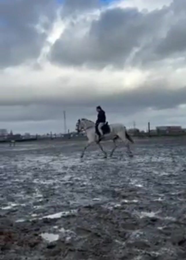 two riders on horses in a muddy paddock. The paddock is muddy with puddles and uneven ground. The sky is cloudy with patches of blue. The first rider is on a light gray horse, while the second rider is on a darker brown horse. Both riders are wearing dark clothing. The horses are moving at a moderate pace, kicking up mud as they go. There is a metal fence visible in the background, as well as what appears to be power lines and buildings.