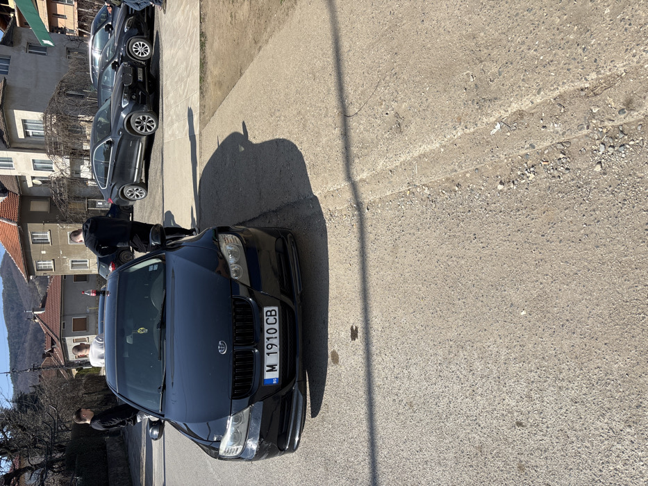 The scene depicts a street in the city of Berkovitsa, Bulgaria, under bright daylight. A black BMW E90 3 Series sedan, bearing Bulgarian license plate M 1910 CB, is parked in the foreground, facing the camera. A red Coca-Cola bottle rests on the vehicle's roof, and an air freshener hangs from the interior rearview mirror. The front bumper of the BMW shows minor scuffs and abrasions. A small, dark liquid stain is present on the pavement directly in front of the car. Three adult males are observed in the immediate vicinity of the BMW. One male, wearing a white t-shirt, stands on the driver's side of the car, facing towards the front of the vehicle. Another male, in a black long-sleeve shirt, stands on the passenger's side, facing away from the camera. A third male, dressed in a black jacket and pants, is positioned near the passenger side, appearing to move towards the right of the frame with his back mostly to the camera. Further down the street to the right, a black BMW X4 SUV and a black Mercedes-Benz sedan are parked, followed by additional indistinct vehicles. The ground in the foreground is an uneven asphalt or concrete surface with visible cracks, scattered gravel, and minor debris including cigarette butts. The right side of the road transitions to a gravel shoulder and a lighter-colored paved area. In the background, multiple multi-story residential buildings with various facades and orange-tiled roofs line the street. Bare deciduous trees and vines are visible against the structures. Distant hills or mountains frame the horizon under a clear blue sky. Strong, direct sunlight illuminates the scene, casting distinct shadows.