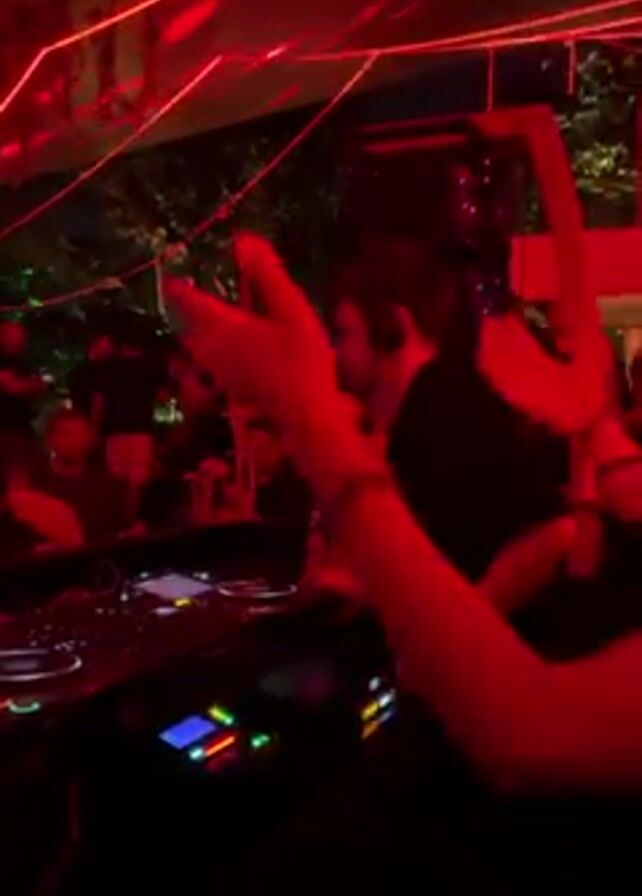 The video is filmed inside a dimly lit venue, possibly a nightclub, with red lighting. A DJ stands behind a DJ console, which is illuminated with various colored lights. A crowd of people is visible in the background, some of whom are dancing or raising their hands. There are red laser lines across the ceiling. The overall atmosphere seems energetic and festive.
